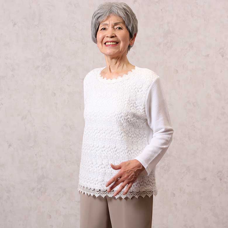 (素材)ポリエステル95% ポリウレタン5% レース部分:レーヨン100%(カラー展開)ホワイト・ブラック(生産国)韓国製70代80代の方のためのおしゃれなシニアファッション(ハイミセス向け)の洋服を多数取り揃えています。